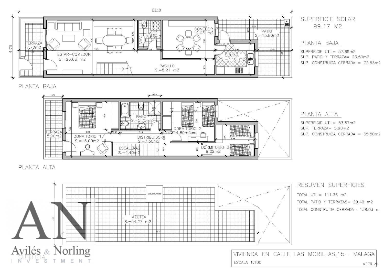La vivienda es un chalet pareado distribuido en dos plantas, con 165 m² construidos (135 m² útiles) y una parcela de 99 m². Dispone de 3 dormitorios, 2 baños, armarios empotrados, terraza y balcón, lo que aporta amplitud y buena luminosidad. Se encuentra en buen estado de conservación y cuenta con espacios exteriores perfectos para disfrutar del clima de Málaga. Un lujo urbano listo para entrar a vivir.
